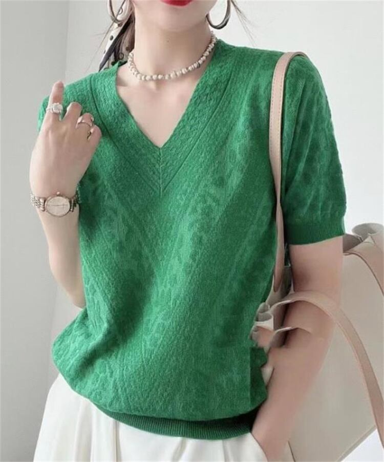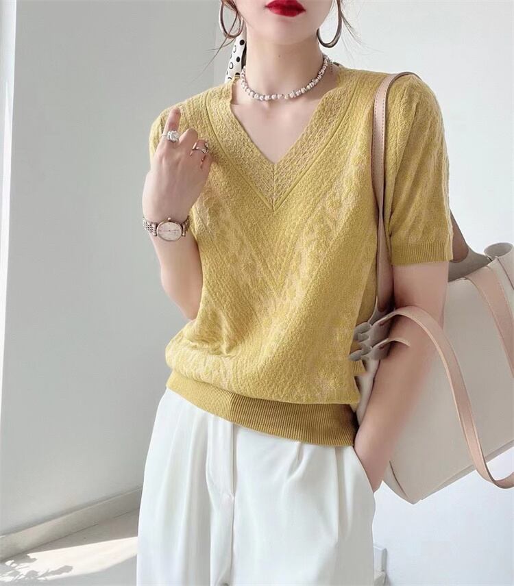ご要望多数につき再販開始 ニットトップス レディース パフスリーブ 半袖 vネック 透かし彫り トップス
