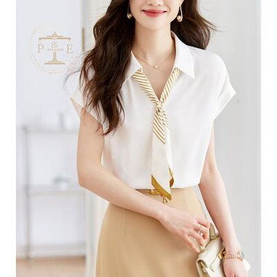 ブラウスレディース 半袖ブラウス 夏 オフィスブラウス ボーダー柄リボン オシャレブラウス フレンチスリーブトップス 韓国風 大人通勤OL ゆったりシャツ40代
