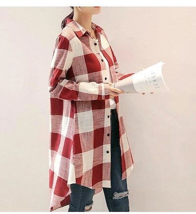 シャツ ブラウス 長袖 レディース チェック柄 シャツ 大きいサイズ 綿麻風 長袖シャツ ロングシャツ シャツブラウス 春 ロングシャツ ゆったり 体型カバー アウター 羽織り カジュアル ナチュラル | geeegood