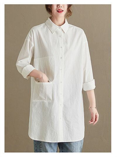 チュニック ロングシャツ レディース 春 長袖シャツ ロング丈 無地 長袖 シャツブラウス トップス アウター 羽織 シャツ ブラウス 折り襟 大きいサイズ ゆったり シンプル 折り襟 前開け 通勤シ | geeegood