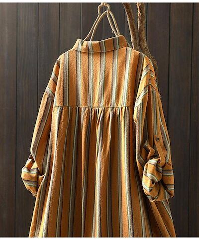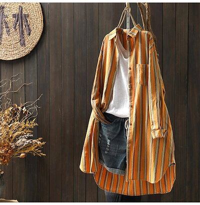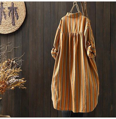 配色 ストライプ シャツ 長袖 シャツブラウス レディース ロング シャツ トップス チュニック 春 秋 羽織り カジュアル ナチュラル 綿 大きいサイズ 体型カバー はおり 裾前後差 ギャザー 袖ロ | geeegood