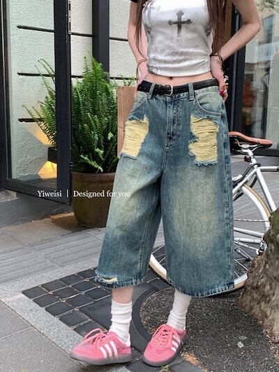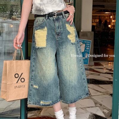 2024春夏パンツ デニム ジーンズ 7分丈 ダメージ加工 ウォッシュ加工 ワイド ハイウエスト 美脚効果 脚長効果 細見え 夏 おしゃれ かわいい 韓国ファッション レディース お出かけ | geeegood