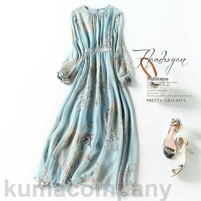 ワンピース ドレス 袖あり ボタニカル 珊瑚 エレガント レディース きれいめ カジュアル おしゃれ 大人 可愛い フェミニン ロング丈 シフォン ナチュラル ハイウエスト Aライン 薄手 涼 | geeegood