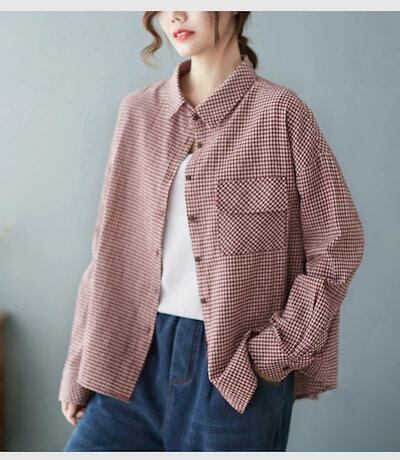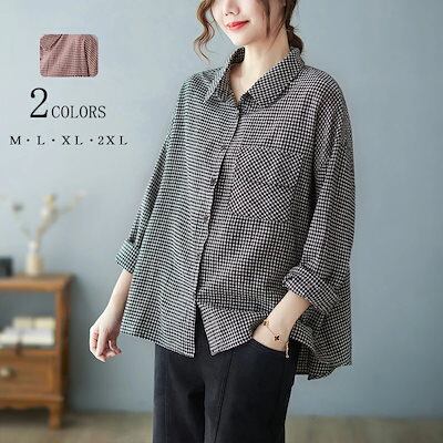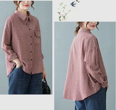 シャツ ブラウス トップス レディース 長袖 チェック柄 長袖シャツ リネン シャツブラウス 秋 コットン ゆったり 大きいサイズ 体型カバー カットソー 重ね着 折り襟 ボタン留め おしゃれ 前開き | geeegood