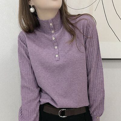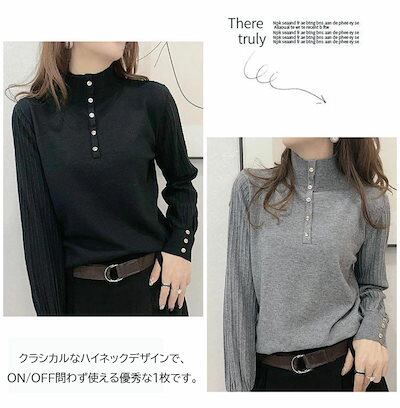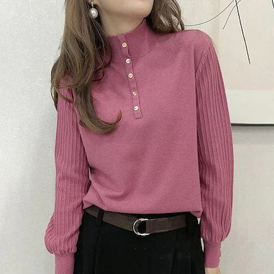 ハイネック ニット セーター レディース プリーツ トップス ニットトップス パフスリーブ 長袖 フリー ボリュームスリーブニット 襟ボタン 袖ボタン ボリュームニット 秋 冬 秋冬 | geeegood