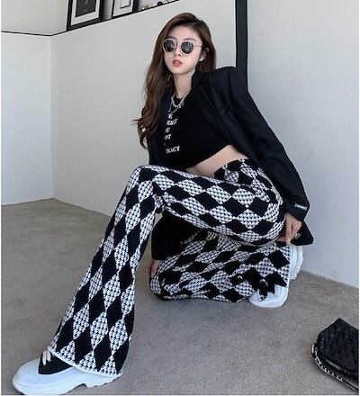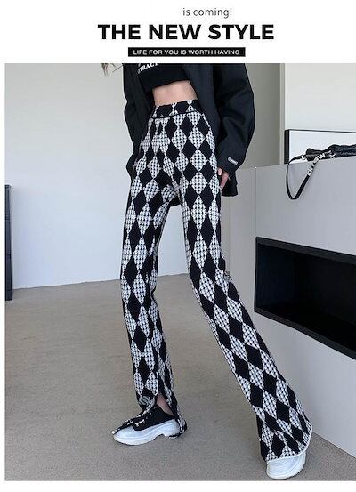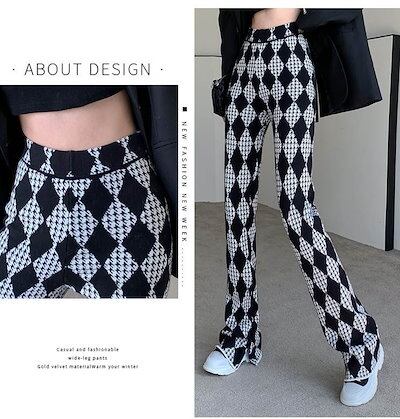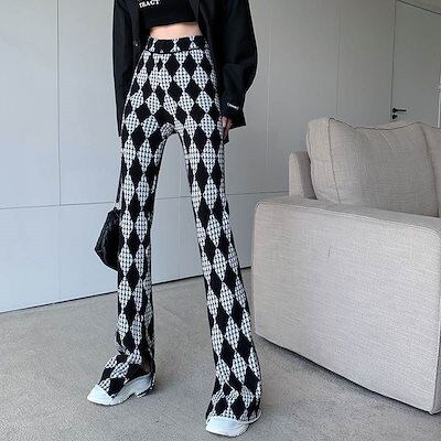 パンツ ロング丈 カジュアル スリット アーガイル タイト チェック柄 黒 ズボン ボトムス ハイウエスト モップフレア モダン レトロ 個性的 カッコイイ 柄 春 夏 秋 冬 レディース S M L | geeegood