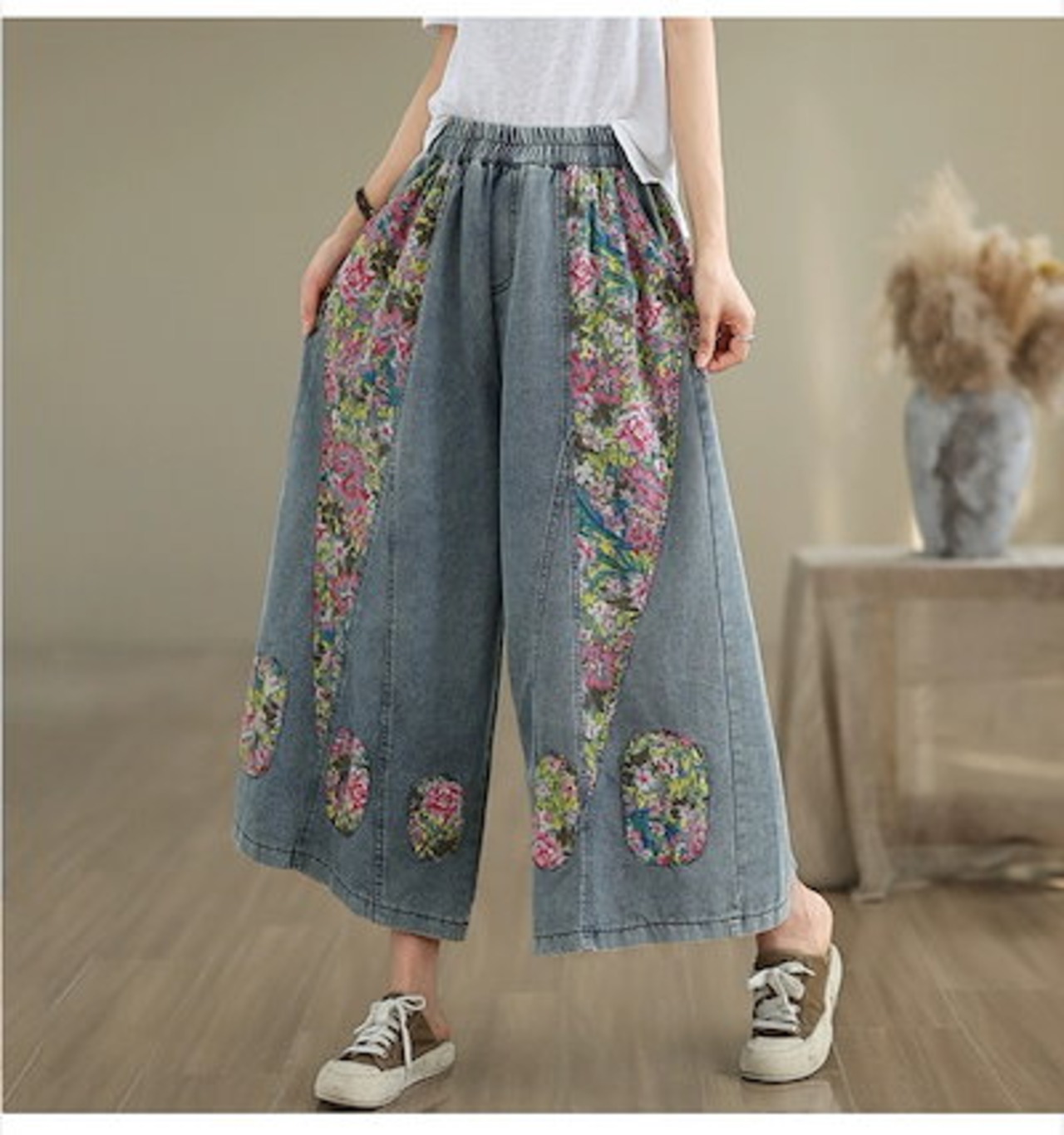 デニムパンツ ワイドパンツ 夏 ロングパンツ デニムパンツ レディース ボトムス きれいめ ガウチョパンツ スカーチョ バギーパンツ 大きいサイズ テーパードパンツ ウエストゴム ロールアップ ノアー | geeegood