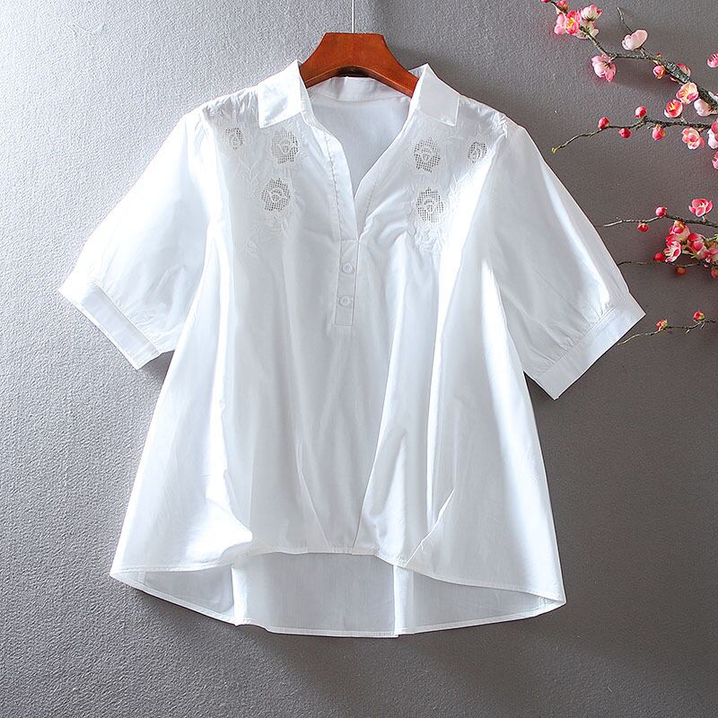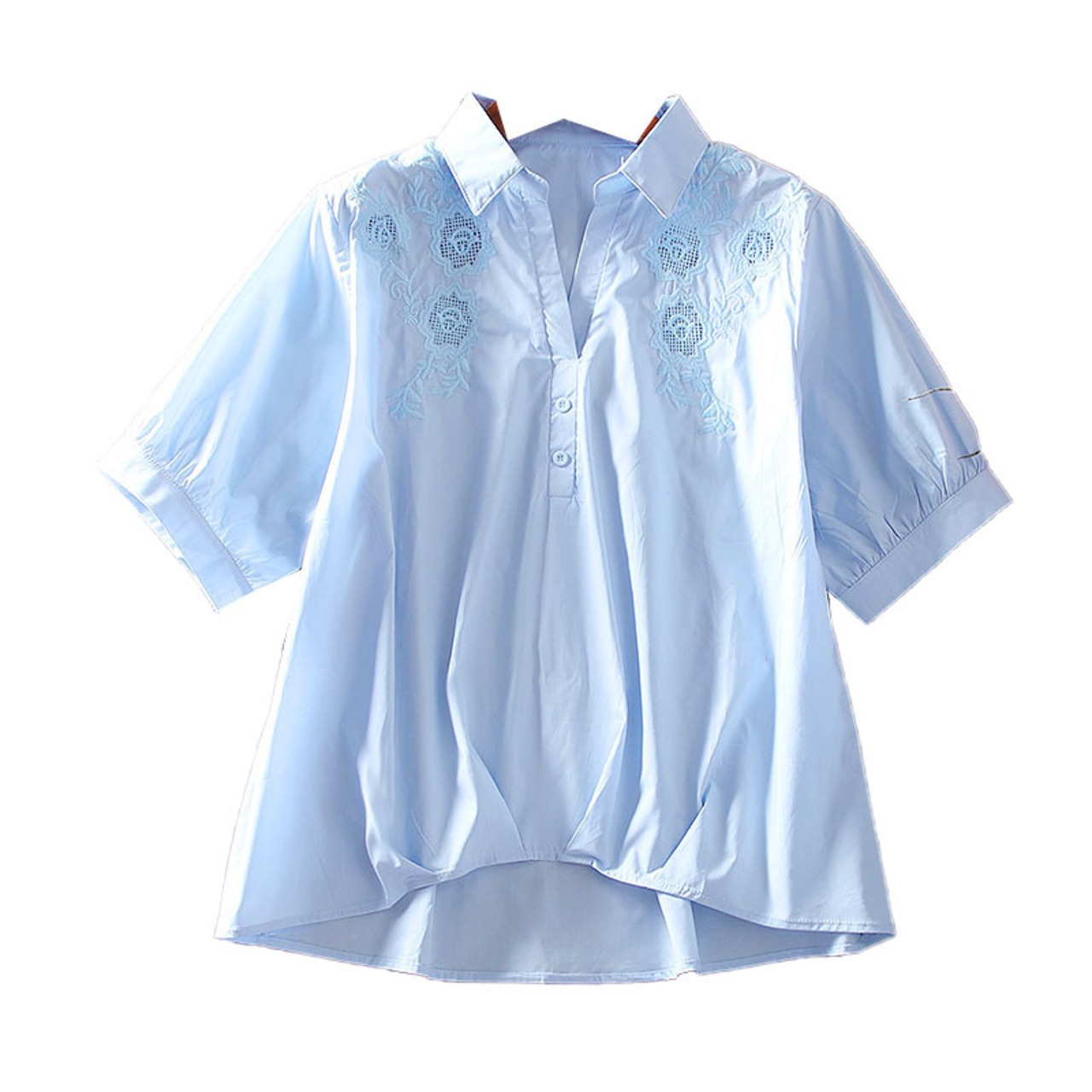 初回送料無料 刺繍半袖透かし彫りシャツ ゆるい襟折り上着 レディースファション商品 人気トップス