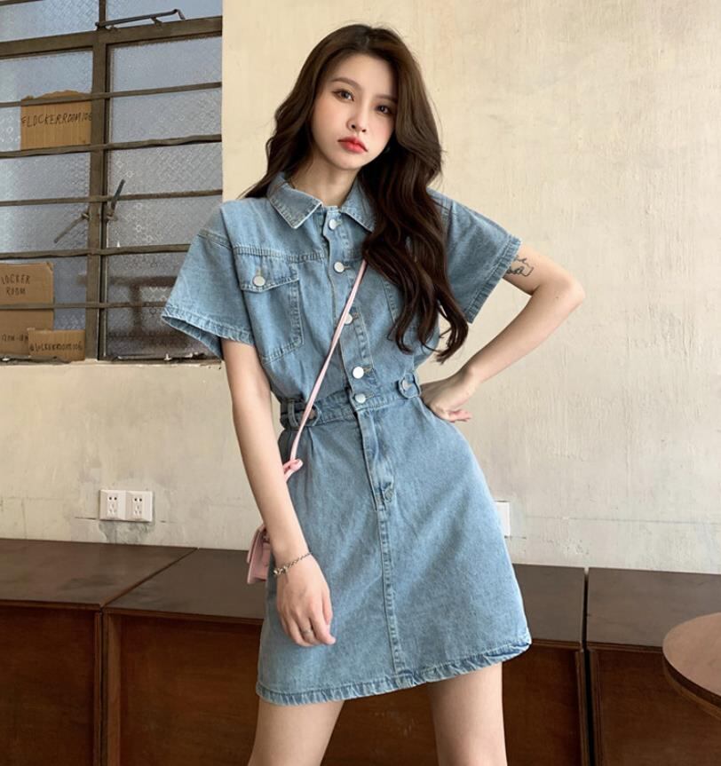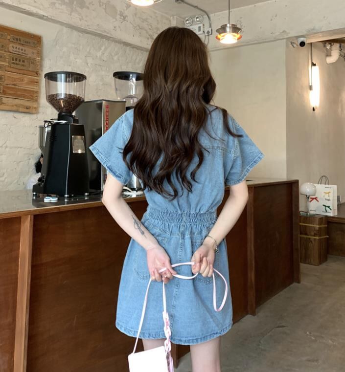 春夏新作 女 レディース ハイウエスト 半袖 デニム ミニ ワンピース ドレス 台型スカート S-L
